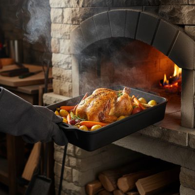 A 47×29×7,5 cm-es öntöttvas tepsi kifejezetten nagy hőfokon történő sütéshez készült. A kemencében, sütőben vagy akár nyílt hőforrás közelében is megbízhatóan teljesít, miközben az öntöttvas anyag gondoskodik az egyenletes sütési eredményről.