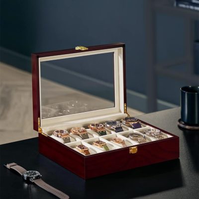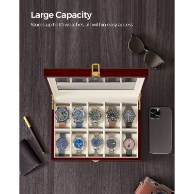 Óradoboz, 10 órás óratok nagy üvegfedéllel, kivehető órapárnák, bársony bélés, óradoboz-rendező, ajándék szeretteinek, cseresznye színű: