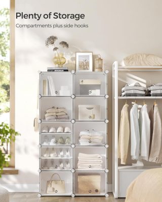 • Szellőző és könnyen tisztítható: A műanyag cipőszekrény átlátszó ajtókkal rendelkezik, amelyek por- és vízálló védelmet nyújtanak, miközben jól láthatóvá teszik a cipőket. Az ajtókon lévő szellőzőnyílások megkönnyítik a nyitást és elősegítik a szellőzést.