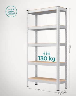 • 5 szintes polcrendszer, acél polcrendszer tároláshoz, csavarmentes összeszerelés, teherbírás 650 kg, 30 x 75 x 150 cm, ezüst