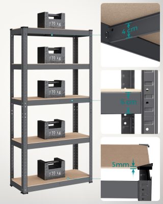 • [Nagy méret, nagy kapacitás] 30 x 75 x 150 cm-es méretével és 650 kg összterhelhetőségével ez a polcegység garázsban, raktárban, pincében vagy háztartási helyiségben is használható az összes szerszám és felszerelés rendszerezéséhez