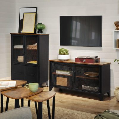 Meleg, rusztikus, barna fatónusok, fekete acélkeret, sűrű hálós ajtók és kúpos lábak – ezek az akcentusok egybeolvadnak ezen a tárolószekrényen, így elegáns ipari darabbá válik, amely megjelenést kölcsönöz otthonának.