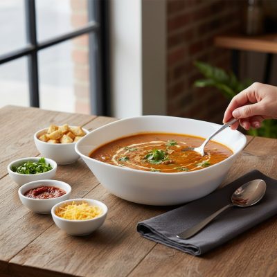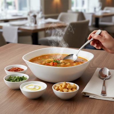 Kiváló választás például egy sütőtök krémleves tálalásához, ahol a krémes textúra és a színek szépen érvényesülnek az opál üveg homogén felületén.