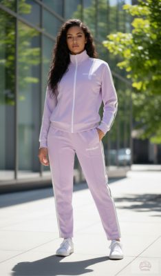 Design: Klasszikus tréning fazon, amely egy cipzáras felsőből és egy egyenes szárú nadrágból áll.
