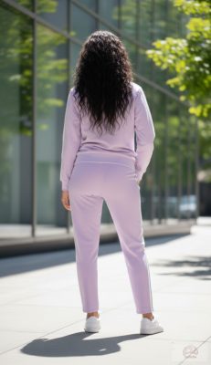 Nadrág: Rugalmas derékrész, az elején vasalt élhatású varrással, amely elegánsabb sziluettet kölcsönöz a sportos viseletnek.