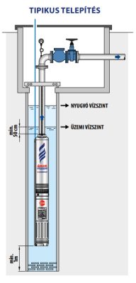 Ez a búvárszivattyú – ezt fentebb már szintén írtuk, de nem lehet elégszer hangsúlyozni - konstrukciójánál fogva akár vízszintes telepítésre is alkalmas, de ebben az esetben mindenképpen ún. köpenycsövet kell alkalmazni!
