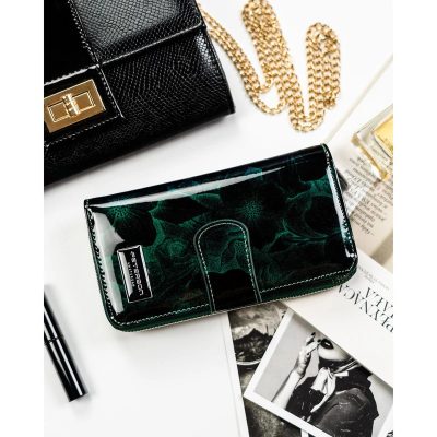 Nagy, piros női pénztárca virágokkal, lakkbőrből, patenttal és cipzárral, Peterson