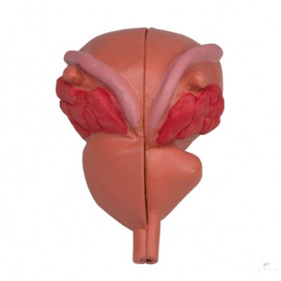 Ez a modell nagyon hatásosan mutatja a prosztata BPH által okozott változásait. A modell egyik oldalán egy egészséges prosztata látható hólyaggal, a másik felén pedig egy beteg prosztata a húgycső szűkületével és maradék vizelettel. Levehető állványon.