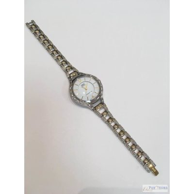 Ezüst és arany színű karóra, számlapja kerek, fehér hátlappal, arany számokkal, fém szíjjal, acél hátlappal! A számlapja kerek, 33 mm, Hossza max 21 cm, ami a szemek kivételével változtatható. Az órát teljes hosszában kristályok díszítik,