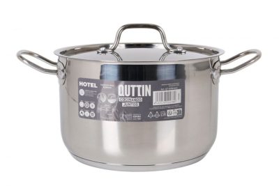 A Quttin Hotel magas lábas fedővel 5 literes egy 22 cm átmérőjű, magas falú, 18/10 rozsdamentes acél edény. A 0,8 mm falvastagság és a vastag szendvics alj kiváló hővezetést biztosít, így minden tűzhelyen – beleértve az indukciót is – egyenletesen főzhetsz.
