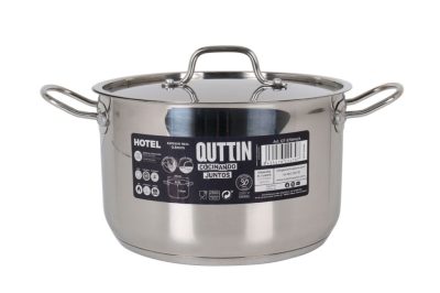 A Quttin Hotel magas lábas fedővel 6,5 literes egy 24 cm átmérőjű, magas falú, 18/10 rozsdamentes acél edény. A 0,8 mm-es falvastagság és a vastag, szendvics kialakítású alj kiváló hővezetést biztosít, így minden főzőfelületen, beleértve az indukciót is, egyenletesen készülnek el az ételek.