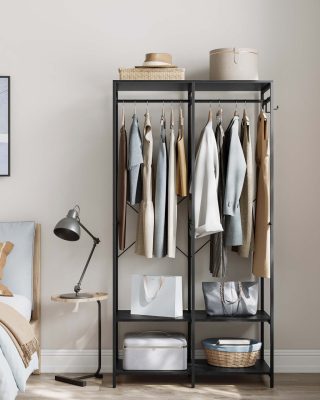 • Ruhatartó, nagy teherbírású ruhatartó, akasztórudakkal, tárolópolcokkal, ébenfekete