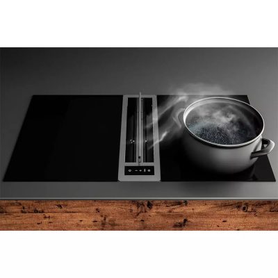 A fekete üveg előlapon elhelyezett érintővezérlés egyszerű, megbízható használatot kínál: egy finom érintésre a középső panel motoros mechanikával 90°-ban felemelkedik a pultból, aktiválva a nagy hatékonyságú elszívást. A 3 fokozat és a turbóüzemmód precízen igazítható a főzés intenzitásához; nagy terhelésnél azonnali reakciót és gyors levegőtisztítást biztosít. A főzés végeztével az elszívó visszasüllyed a munkapultba, megőrizve az egységes, elegáns megjelenést és csökkentve a porosodó felületek számát.
