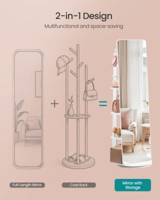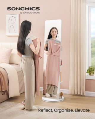 • Tükör és tárolás egyben: Ez a nagy, tiszta teljes alakos tükör leegyszerűsíti a mindennapi öltözködés ellenőrzését. A hátoldalon 4 polc és 4 akasztó található a további tároláshoz, a 360°-ban forgatható kialakítás pedig biztosítja, hogy minden könnyen elérhető legyen.