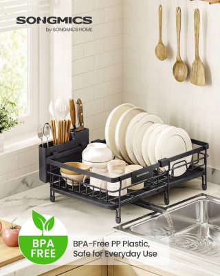 új SONGMICS edényszárító állvány, kihúzható mosogató szárító, 360° vízelvezetés, tintafekete