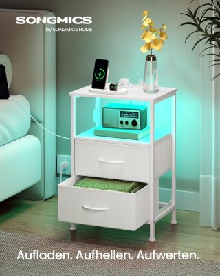 • SONGMICS éjjeliszekrény töltőállomással, állítható LED-világítással, hófehér