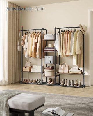 új SONGMICS HOME dupla ruhaállvány 6 polccal, 136 kg teherbírás, dió/fekete