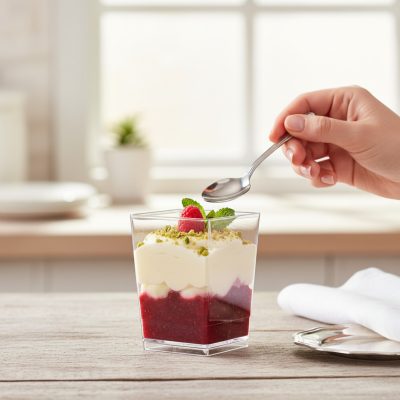 A Square 120 ml-es pohárkrém-desszert tégely az olasz Martellato gyár prémium terméke, amely a funkcionalitást és a dizájnt ötvözi. Az átlátszó, letisztult forma kiemeli a rétegezett édességeket, miközben higiénikus és praktikus megoldást nyújt.