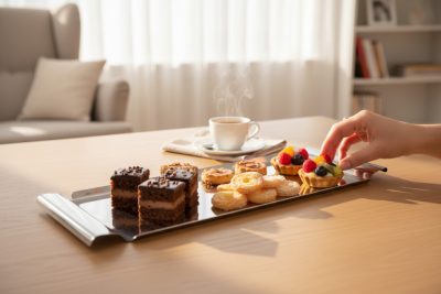 A 45×15 cm-es keskeny süteményes tálca kifejezetten olyan tálalási helyzetekre készült, ahol fontos a helytakarékosság és az átlátható kínálás. Ideális aprósütemények, sós falatok, teasütemények vagy finger food tálalásához.