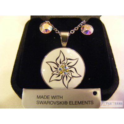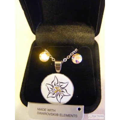 Az Ékszer szett viselőjének szépséget, tisztaságot, finomságot kölcsönöz. A vakítóan fehér tűzzománc jellegű medálra finom vonalvezetésű virág motívum van festve, aminek közepében 3 pici színjátszó kristály csillog.