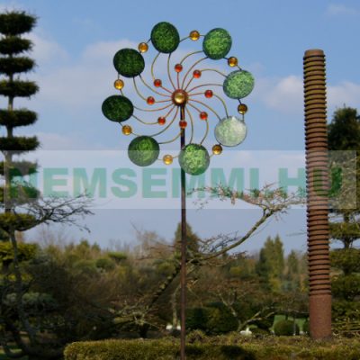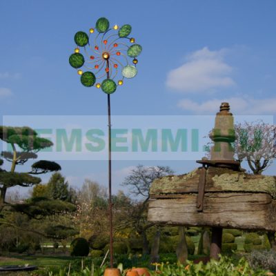 Az egzotikus virág megjelenésű szélkerék szemet gyönyörködtető látvány a kertben, a tetőteraszon vagy az erkélyen. A zöldesen csillogó kerek levelek, amelyek a szélkerék belsejében lévő vöröses-sárga gyöngyöket körülveszik. A golyóscsapágyházhoz használt fém, maguk a golyóscsapágyak, a lakkozott felület és az a könnyedség, amellyel a forgó elemek a szélben forognak, lélegzetelállító látványt nyújtanak. A részletekre való odafigyelés, az egyedi kialakítás és a precíz lakkozás csak néhány pont, amelyek e gyönyörű szélfogó mellett szólnak.