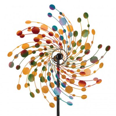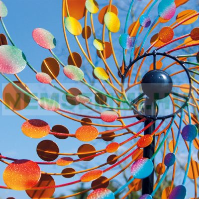 Ez a szivárványszínű és élénk szélkerék gyönyörű színátmenetekkel ragyogja be kertjét minden elképzelhető színben. A rotorlapátok sok apró kerek elemből állnak, amelyek konfettiként kavarognak a levegőben. A golyóscsapágyházhoz használt fém, maguk a golyóscsapágyak, a fényezés és az a könnyedség, amellyel a forgó elemek a szélben forognak lélegzetelállító látványt nyújtanak. A részletekre való odafigyelés, a játékos dizájn és a precíz lakkozás csak néhány pont, amelyek e gyönyörű szélforgó mellett szólnak. A könnyű mozgást a golyóscsapágyak biztosítják, amelyek egy házban vannak elhelyezve. Annak érdekében, hogy a menet feltűnésmentes legyen, az első szélkerék közepén egy színben illeszkedő félgömböt helyeztek el, amely az első golyóscsapágy házaként szolgál. Így a golyóscsapágy tökéletesen rejtve marad.