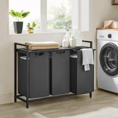 szennyeskosár, 3 rekeszes, szennyeskosár polccal, szennyesdoboz, oxfordi szövet szennyestáska, kihúzható, kivehető, fém keret, 3 x 38 l, 92,5 x 33 x 72 cm, fekete-szürke: