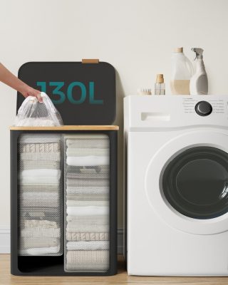 Ez a 130L-es szennyeskosár (52 × 38,5 × 70,5 cm) két rekesszel rendelkezik, így tökéletesen alkalmas egy háromfős család számára a szennyes egyszerű rendszerezésére és tárolására, megkönnyítve a mosási folyamatot.