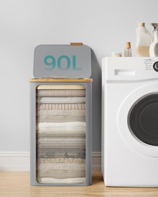 [Tágas] Ez a 90 literes szennyestartó, amelynek mérete 42 x 32 x 70,5 cm, bőséges helyet biztosít egy személy egyheti szennyesének, és megkönnyíti a mosási rutint.