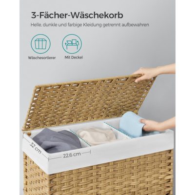 • [3 rekeszes szennyeskosár tetővel] A fedél egy kézzel nyitható és zárható, megakadályozza a szagok kijutását a piszkos ruhaneműből és véd a portól; 3 rekesz világos, sötét és színes ruhák tárolására