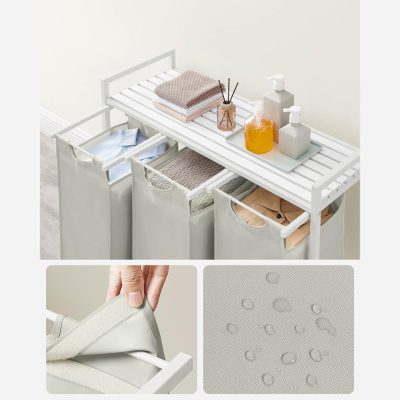 Szennyeskosár, 3 tárolórekesz, 3 kivehető Oxford vászontáska, polc, fém keret, 3 x 38 l, 92,5 x 33 x 72 cm, fehér :