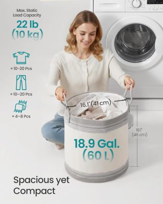 • 【PRAKTIKUS RÉSZLETEK】A nyílásnál található húzózsinór védi a ruhákat a portól, és megakadályozza, hogy véletlenül kiessenek – a magánszféráját is óvja. A fogantyúk pedig megkönnyítik a kosár szállítását.