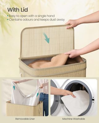 SONGMICS szennyestartó kosár, mosókosár, 90 L-es bambusz ruhatartó, kivehető béléssel, gépben mosható zsákkal, fedéllel, fogantyúkkal, hálószobába, nappaliba, natúr szín