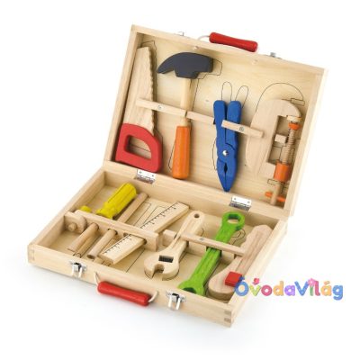 Szerszámok fadobozban (10 darabos) ebben a fadobozban minden megtalálható ami egy szuper barkácsoláshoz elengedhetetlen! Egyszerű készségfejlesztő és ügyességi játék, mely megismerteti a kicsiket a szerszámok világával és azok felhasználásával.