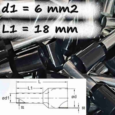 A 6 mm² keresztmetszetű vezetékekhez tervezett hüvely fekete színű szigeteléssel rendelkezik, amely jól illeszkedik szabványos jelölési rendszerekhez és megkönnyíti az áramkörök áttekinthetőségét. A 18 mm-es L1 és 26 mm-es teljes hossz (L) elegendő krimpelési felületet biztosít, így stabil, tartós kötés hozható létre.