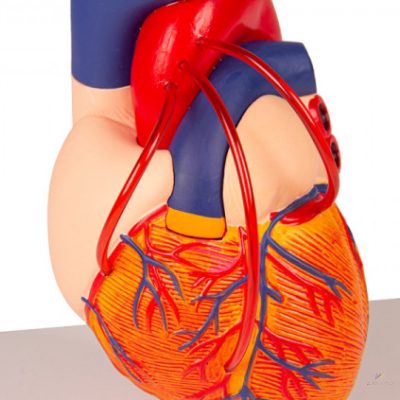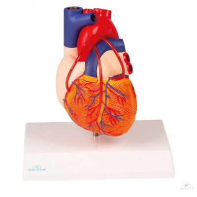 Ez az életnagyságú, kétrészes modell rendkívül részletesen illusztrálja az emberi szív anatómiáját három koszorúér-bypassal. Az elülső fal leválasztható, így láthatóvá válik a belső kamra és a billentyűk. Állványra szerelve.