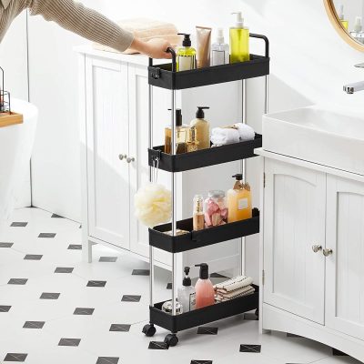 • Erő a tároláshoz: Ez a tároló kocsi erősen épült, bár vékony testben. A robusztus, rozsdamentes acélcsöveken elhelyezett 4 polcon egyenként akár 5 kg rágcsálnivaló és ital, sampon és testápoló, valamint tisztító- és fehérítő spray-palackok is elférnek.