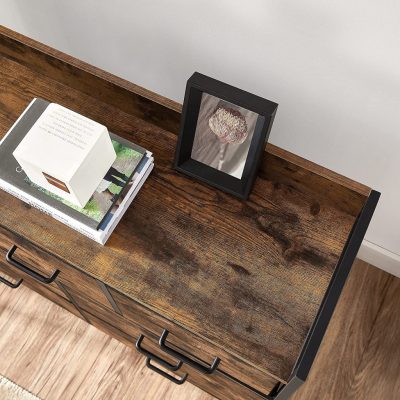 Komód, hálószoba tároló egység, 7 fiókos szekrény, fém kerettel és fogantyúkkal, ipari, rusztikus barna és fekete: