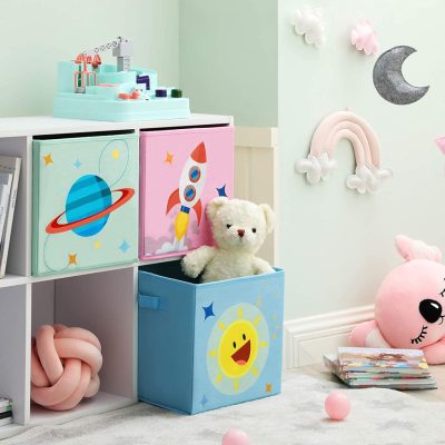 tárolódobozok, 3 db-os szett, Játékrendező dobozok, Összecsukható tárolókockák fogantyúval, gyerekszobába, játszószobába, 30 x 30 x 30 cm, Tér téma, kék, zöld és rózsaszín
