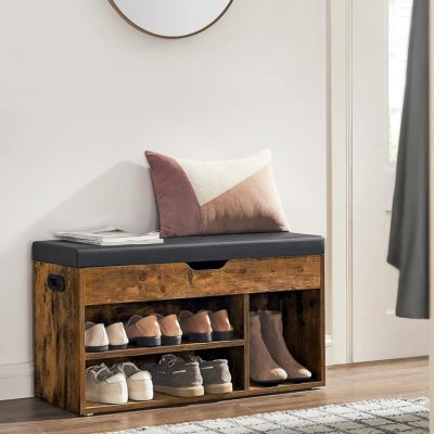 cipőpad párnával, tárolópad párnázott ülőfelülettel, 3 rekeszes, rejtett tárolóhely, polcok, nappali, előszoba, hálószoba, teherbírás 150 kg, rusztikus barna