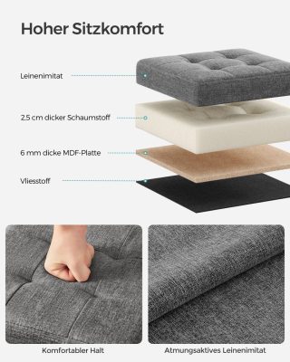 • Elegáns kialakítás és kényelmes ülőfelület: Az ülőke stílusos, lenhatású bevonattal és steppelt mintázattal készül, amely eleganciát visz otthonába. A dupla rétegű szövet és a nagy rugalmasságú szivacs hosszan tartó, kényelmes ülést biztosít