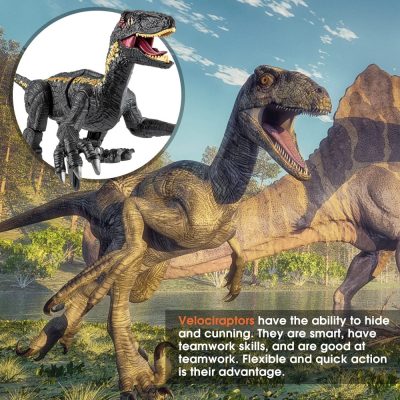 A dinoszaurusz világos fekete arany színben. Bármely testrészét képes mozgatni (áll, nyak, derék, farok). Nyomd meg a fej gombot a távirányító dinoszauruszának vezérléséhez, hogy előre/hátra mozogjon, és nyomd meg a lábgombot a sétáló raptor balra/jobbra fordulásához. Nyomd meg az "ONE-KEY DEMO" gombot, hogy a dinoszaurusz egy akciócsoportot mutasson be a gyereknek, farkcsóválva, ordítva, előre/hátra és jobbra/balra fordul. Minden viselkedés életszerű.