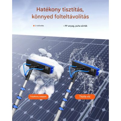 • Teleszkópos mosókefe 3,6 m hosszúságig kihúzható nyéllel és 20 m tömlővel 180 fokban állítható fejjel napelemek és kültéri felületek tisztításához