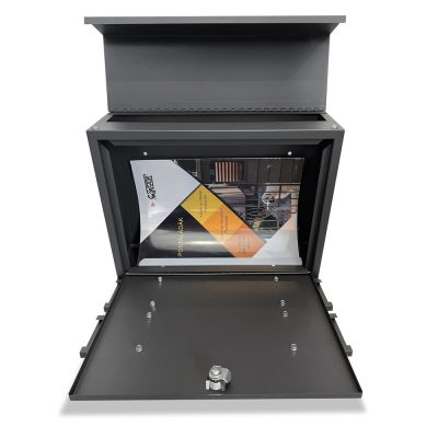 Falra, kerítésre szerelhető, felső bedobónyílással ellátott, nagy méretű küldemények fogadására fejlesztett levélszekrény alsó szórólaptartóval.