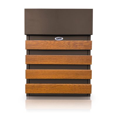 Fa hatású dekor csíkokkal díszített, fa hatású kerítésekhez illeszkedő stílusú postaláda,