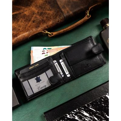 Ez a stílusos és praktikus férfi bőr pénztárca tökéletes választás mindennapi használatra! Elegáns fekete színével és jól átgondolt kialakításával garantáltan kielégíti minden igényedet.