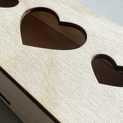 A doboz természetes fából készül, a fedélen látható minta precíz lézervágással, gondos kézi utómunkával.