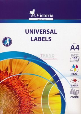 Victoria 70 x 42,4 mm méretű, 3 pályás, fehér színű, matt felületű, univerzális, nyomtatható öntapadós etikett címke A4-es lapon, normál tapadású ragasztóval, hegyes sarkokkal, általános címkézési feladatokra.