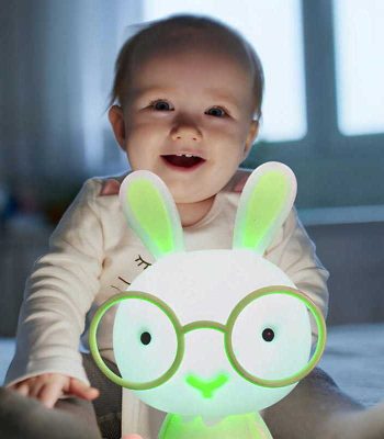A nyuszi hasán egy csendes kapcsoló található, amely nem ébreszti fel a babát alvás közben.