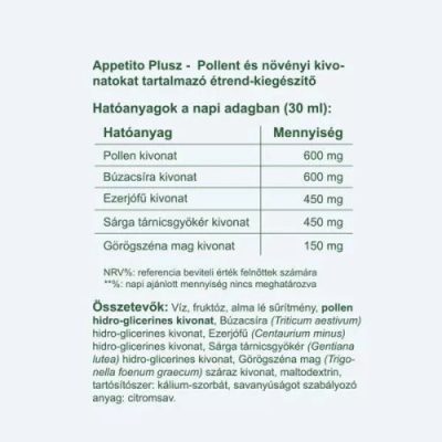 Összetevők: Víz, fruktóz, alma lé sűrítmény, pollen hidro-glicerines kivonat, Búzacsíra hidro-glicerines kivonat (Triticum aestivum), Ezerjófű hidro-glicerines kivonat (Centaurium minus), Sárga tárnicsgyökér hidro-glicerines kivonat (Gentiana lutea), Görögszéna mag száraz kivonat (Trigonella foenum graecum), maltodextrin, tartósítószer: kálium-szorbát, savanyúságot szabályozó anyag: citromsav.